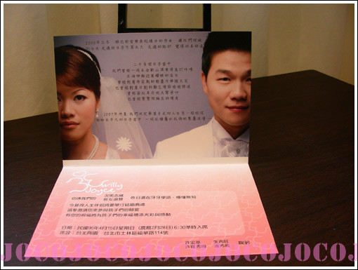 而且還故意什麼都不標明喔!! 看看收到喜帖的人猜不猜得到哪個是新郎哪個是新娘... 講實在不說真的猜不到... 聽說很多人都猜錯呢!