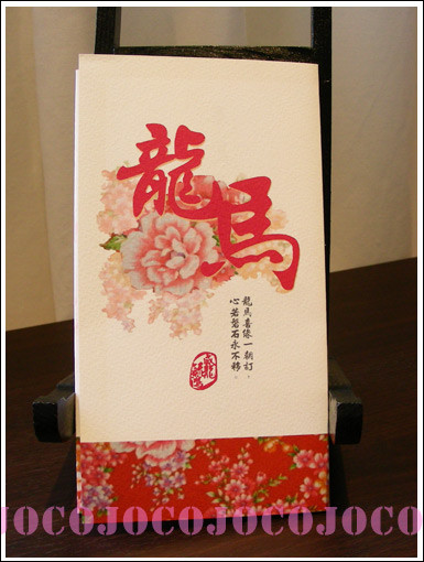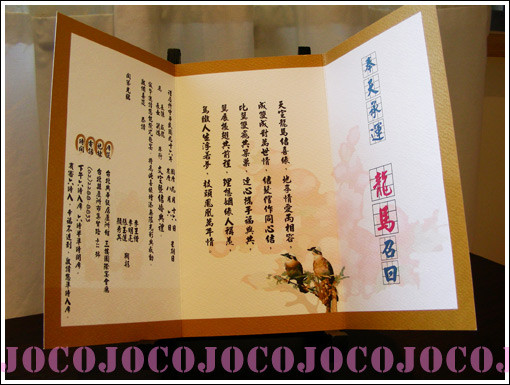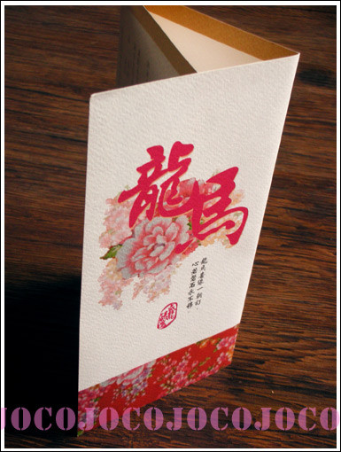 喜帖內裡,做得像聖旨一樣,為什麼用"龍馬".. 因為Nicky跟Bruce的名字裡面就有龍馬兩個字,不過差點Joco就給他做"龍馬精神"了 (香港過年的時候,除了恭喜發財,龍馬精神應該是最常講的恭喜的話了!!)