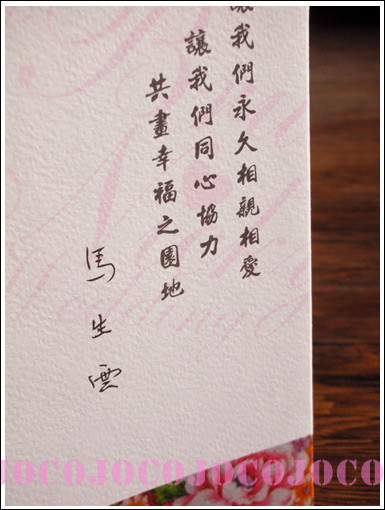 富有中國風味的喜帖,本來下面印刷的"阿媽的布"是要用真的布去貼的...但是,Nicky說既然印刷了,那他就省省功夫了!! 後來,Joco說那省了這到功夫的話,要去買金色的流蘇來把喜帖綁住,整體的感覺會更高雅.... Nicky也同意了,可惜的是... 現在延期到不知道哪天... 所以他也就還沒動手做了....