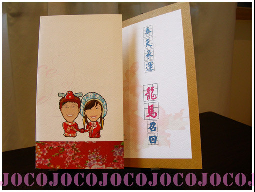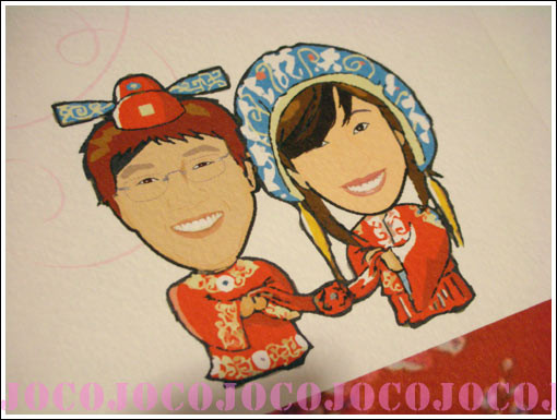 Nicky他們有請Joco繪製手繪可愛的人像,所以當然喜帖也不能少了他們啦! 不過本來的比基尼婚紗跟大同寶寶裝應該不適合用在這裡吧!! 哈哈 那就來個傳統一點的新娘新郎吧!