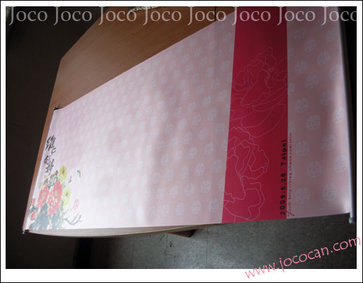 沒想到..拿到手的時候,一捲長長的就讓Joco覺得不妙了!!! 原來他的原畫就遠比此簽名綢還大張..應該有80x160左右的感覺.... 笨笨的Joco還在那裡苦惱怎麼掃描... 掃描機才比a4大一點..那不就掃到天荒地老了嗎!!?? 而且還要拼圖... 很難對齊又很難修... 阿~~~~~~~