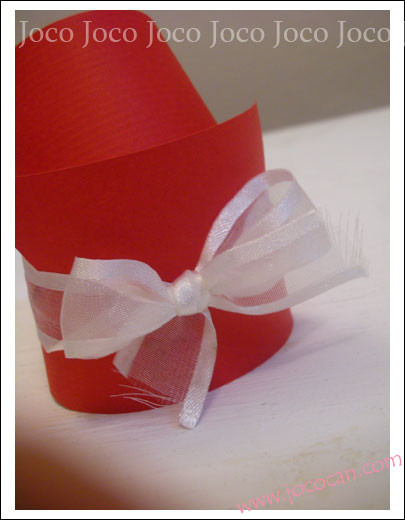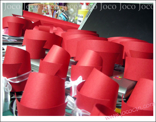 看後面那牌就知道這款是兩張長條的紙型一個捲成圓筒一個圓錐的感覺, 在一個做好圓筒狀兩側切開卡入的缺口,把一張長條的紙卡入缺口後,捲成斜斜的圓錐狀,後面黏住即可。這個圓錐的斜度是桌卡要放的斜度,所以約60-70度左右,別太斜...這樣不僅桌卡會卡不太住,而且會不好閱讀。