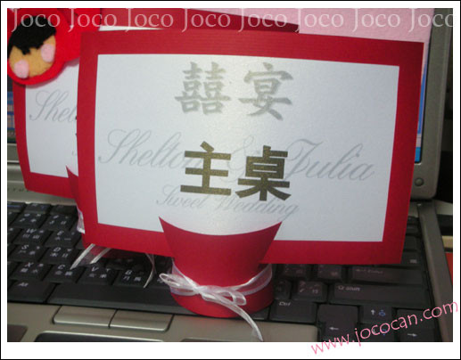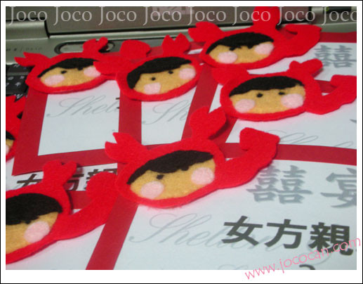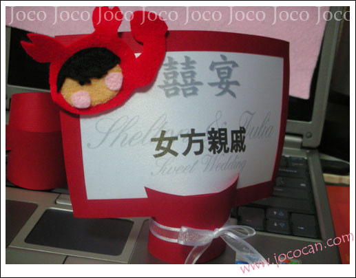 這是女方款的桌卡,用的是婚禮logo上面Julia女天蠍寶寶的圖案,使用不織布戳戳技巧完成的可愛娃娃... 特別喔!! 遠遠就看得出來女方的特別 (男方部分為了省錢,所以..... 哈哈)