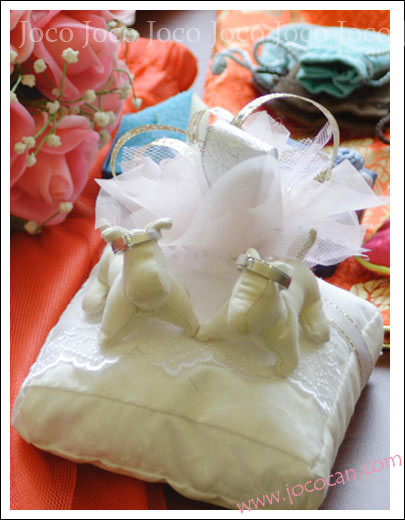 這幾天再跟美國的一位新娘朋友聊天,最近設計喜帖設計到每天都聊天聊到半夜四點(我不是在說你讓我沒睡覺...我沒有...我沒有....) 聊到Joco的結婚愛情故事,就開始翻婚禮時候的照片.... 沒想到就看到這一對嘔心瀝血的狗狗戒枕。