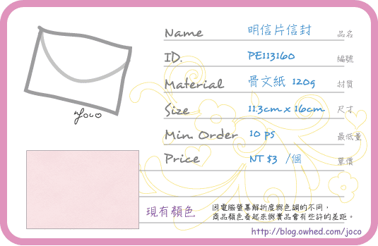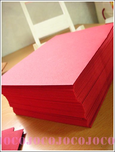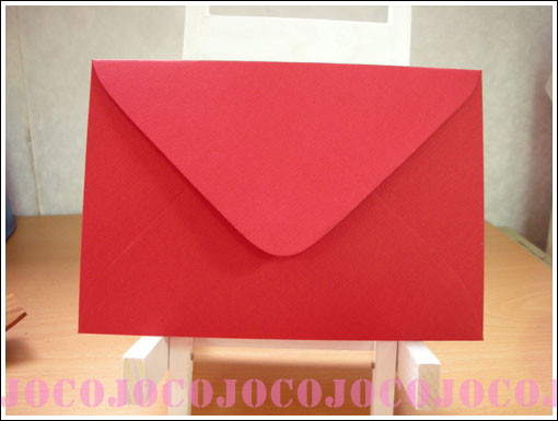 不敢說明信片婚卡是Joco領起潮流的..不過Joco真的是挺早的時候就開始設計明信片大小的婚卡。這個婚卡的最大問題就是外面根本沒有幾家廠商在賣這樣尺寸的紅色信封,Joco那時候也是跑了大概有七八家的信封廠商,才找到紅色及粉紅色兩種信封... 紅色當然是長輩一定可以接受的,但是此款的粉紅色,就有點接近白色..超級淡的,有些新人沒有回家先問過就購買,之後還是要來補紅色的回去給長輩